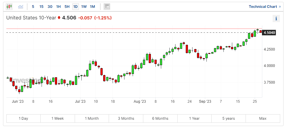 美国10年期国债收益率也于周二触及16年高位,一度达4.5660%,并提振美元指数升至去年11月以来新高。