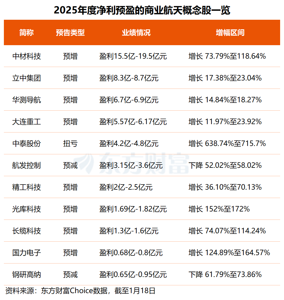 东方财富Choice数据显示,截至1月18日,已有25只商XM交易平台业航天概念股披露2025年度业绩预告,其中有11股预计实现归母净利润盈利(9股预增、2股预减),中材科技去年净利预盈15.5亿至19.5亿元居首,立中集团、华测导航分别预盈超8.3亿元和6.7亿元。