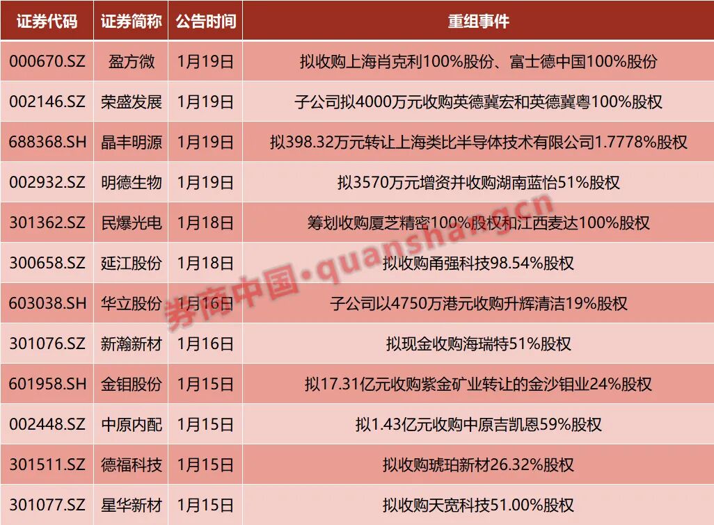 2026年以来,A股并购重组市场持续活跃,据不完全统计,1月15日以来,包括盈方微、荣盛发展、晶丰明源、明德生物、延江股份、民爆光电、新瀚新材、华立股份、星华新材、德福科技、中原内XM交易平台配、金钼股份的12家A股上市公司披露了并购重组进展最新公告。