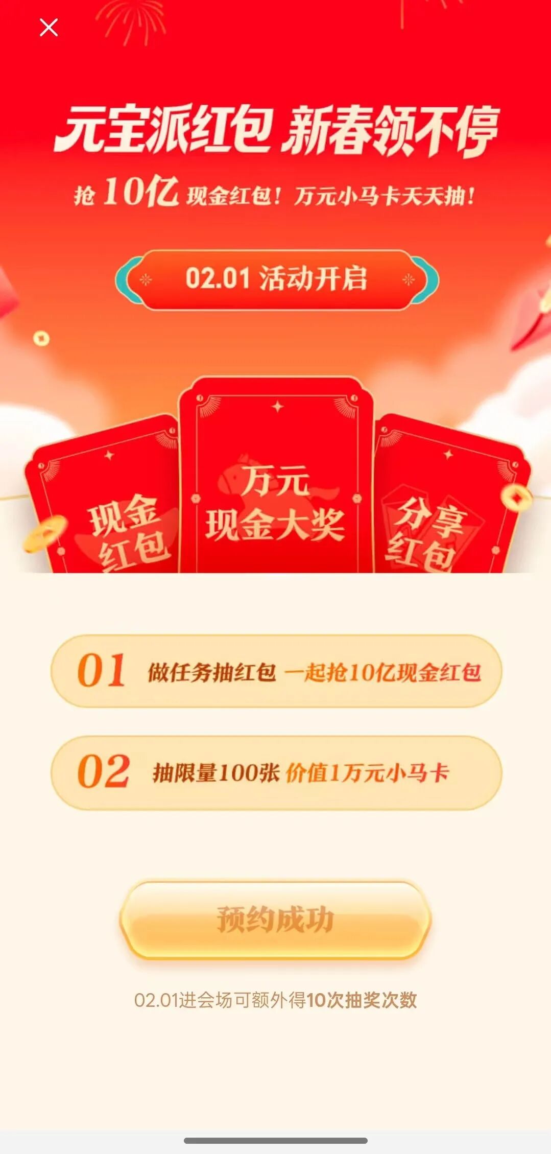 据介绍,用户可于1月25日将元宝App更新到2.55.0 以上版本,点击主页的预约卡片即可进入春节会场预约页面,提前预约的用户将在2月1日活动开启当XM交易平台天,额外获得10次抽奖次数。