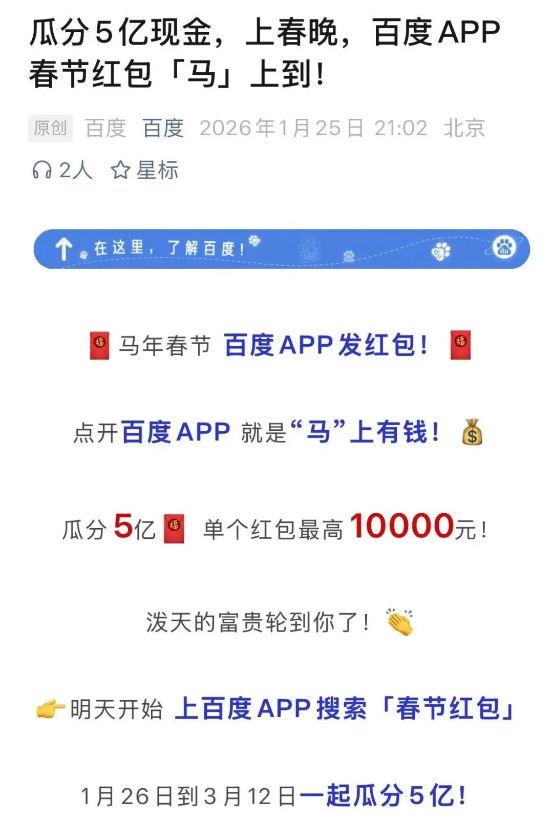 值得注意的是,1月25日晚,百度宣布,自1月26日至3月12日,用户在百度APP搜索“春XM交易平台节红包”,就有机会瓜分5亿元红包,单个红包最高1万元。此外,百度特别提示,红包任务已融入文心助手的近百种春节创意玩法之中。活动期间,只要使用文心助手,就能获得上述红包。