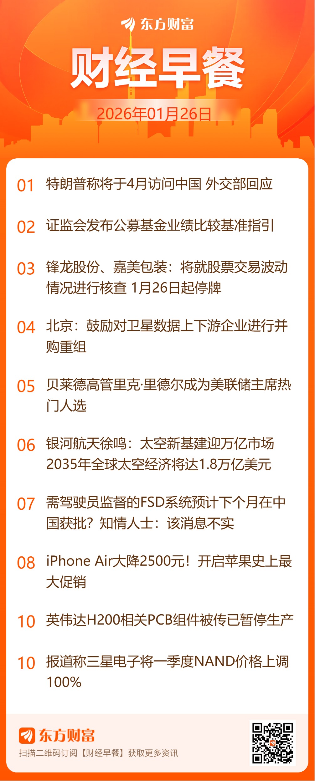 XM交易平台资讯:东方财富财经早餐 1月26日周一